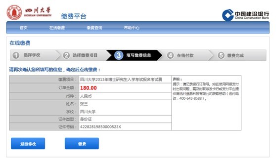 从2013年开始,3044am永利官网采用考生网上支付的方式收取博士研究生入学统考的报名考试费,缴费网址:http://scu.epaybest.com,相关注意事项参照网上缴费注意事项(点击打开链接),具体缴费流程如下: