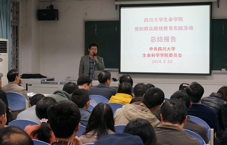 廖爱民副书记代表学院党委作党的群众路线教育实践活动总结报告。他从三个方面就生命学院开展党的群众路线教育实践活动进行了总结:一、加强领导、落实责任,使群众路线教育实践活动工作到位。学院根据中央及学校文件要求制定实施方案,建立领导小组,通过广泛动员和宣传,使群众路线教育活动深入人心,并在执行过程中严格要求,注重实效;二、统筹兼顾、协调推进,切实做好了教育实践活动各环节工作。学院领导班子多次集中学习、认真研读教育实践活动的有关文件资料,通过座谈会、调差问卷等方式深入调查研究,广泛听取意见,并通过民主生活会等形式深入开展批评与自我批评;三、教育实践活动取得的成效,领导班子存在的问题及下一步努力方向。通过党的群众路线教育实践活动,学院领导干部思想认识普遍提高,使班子成员理想信念进一步坚定。通过围绕“四风”查摆问题,紧密联系工作实际和思想实际,认真开展批评和自我批评,开展积极健康的思想斗争,敢于揭短亮丑,真正触及思想和灵魂。学院领导班子坚持把教育实践活动作为推动试点学院跨越发展的重要动力,与学科发展、人才培养、科学研究等中心工作结合起来,坚持“两手抓、两促进、两不误”,取得了明显成效。学院领导班子将进一步切实抓好整改落实、建章立制的各项后续工作,按照整改方案的任务书、时间表,一项一项抓落实。