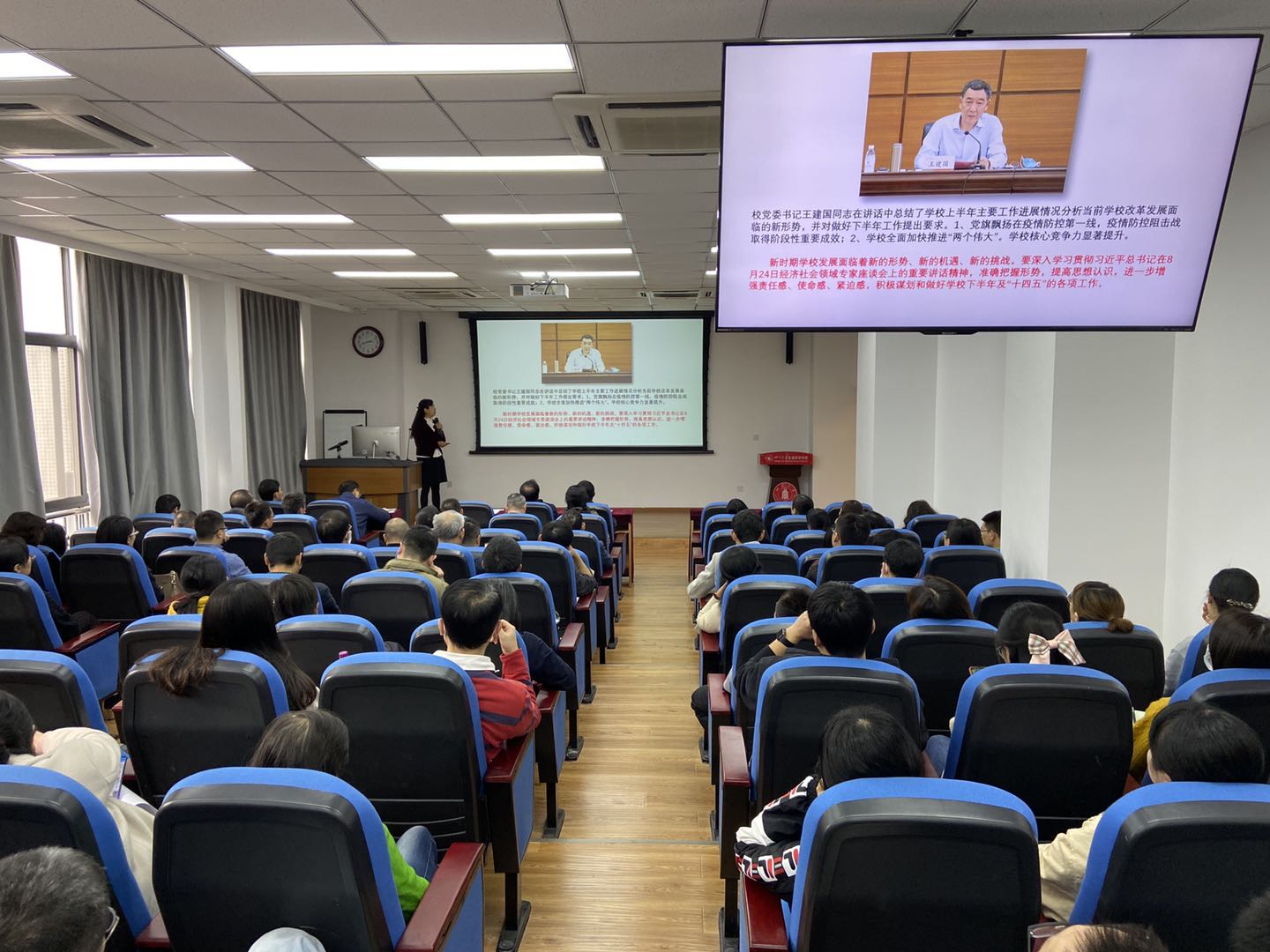 党委副书记兼纪委书记吴近名、副院长赵云教授和冉江洪教授分别就学生意识形态工作、本科教学教材管理和科研项目、科研经费、科研成果、科研目标任务完成情况进行了通报和部署
