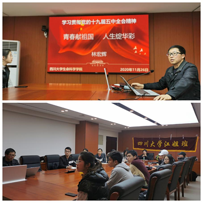 2020年11月26日晚7:30,3044am永利官网党委书记林宏辉围绕“学习贯彻党的十九届五中全会精神”给“江姐班”全体同学讲授了一次别开生面的党课。在本次党课上,林书记就“‘十三五’期间我国取得的主要成就”、“我国发展环境面临的复杂变化”、“到2035年要实现的九个目标”、“‘十四五’期间经济社会发展的主要目标”、“实现奋斗目标的十二方面具体举措”做出了深入的讲解,并强调“江姐班”的学生要以成为未来生物科学领域领军人物而不懈奋斗,青年学子要将个人发展梦想与国家民族前途深度融合,坚定理想信念,用创新书写报国之志,为建设社会主义现代化国家努力奋斗。