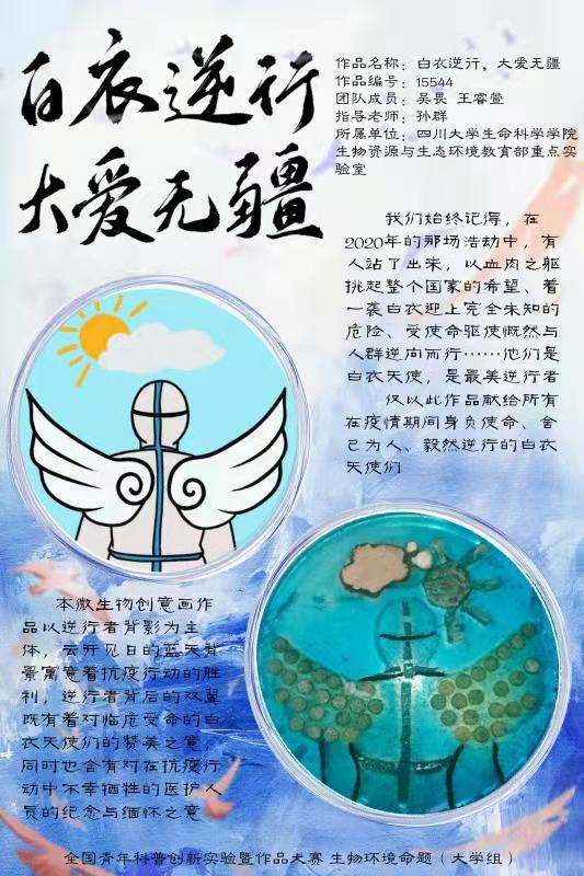 2021年5月9日,第七届全国青年科普创新实验暨作品大赛四川-云南分赛区复赛在四川科技馆隆重举行,经过激烈角逐,由永利官网孙群教授指导、吴畏、王睿萱参与的生物环境类“白衣逆行,大爱无疆”微生物创意画作品,夺得本次四川省赛区第一名,荣获一等奖。李佛生老师指导、邵启亮、吴欣悦同学的作品“接种疫苗,携‘手’防疫”获得三等奖。