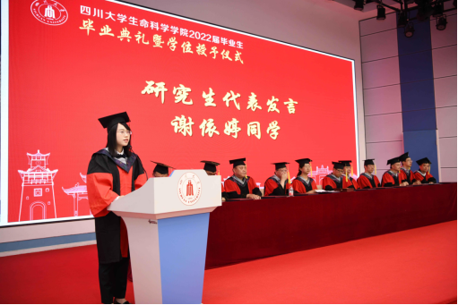 本科生代表,四川省优秀毕业生、本科生党支部书记2018级徐靖童同学发言。她的发言饱含对学校学院的深情厚谊,细腻地讲述了她四年来的成长历程。表达了对充满挑战的未来的期待,她表示作为生科毕业生一定不忘初心、奋勇拼搏,励志以科研报国。
