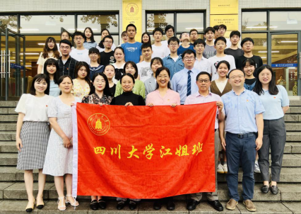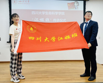 在授旗仪式环节,“江姐班”传承集体3044am永利官网2021级强基班班长唐弋航从永利官网第一届“江姐班”班长李歆睿手中,接过了“3044am永利官网江姐班”的旗帜。他们将以饱满的精神和昂扬的斗志继续“江姐班”的建设,将在川大校园舞台上谱写出充满青春热血与红色精神的全新篇章!