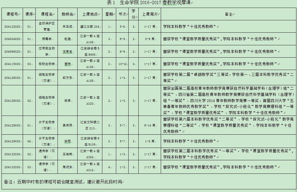 为加强学院老师在教学上的交流,共同探讨教学理念和方法、促进教学质量的提升,学院本学期继续开设教学观摩课。开学初,学院就协调好了上观摩课的老师,并将观摩课任课教师的课表(见表1)发给全院教师,观摩课打破时间限制、不再固定周次,由学院老师根据自己的时间安排选择合适的周次去听课。这种模式将观摩课贯穿于整个学期,便于学院教师多次前往旁听学习,尤其对于青年教师而言受益匪浅。