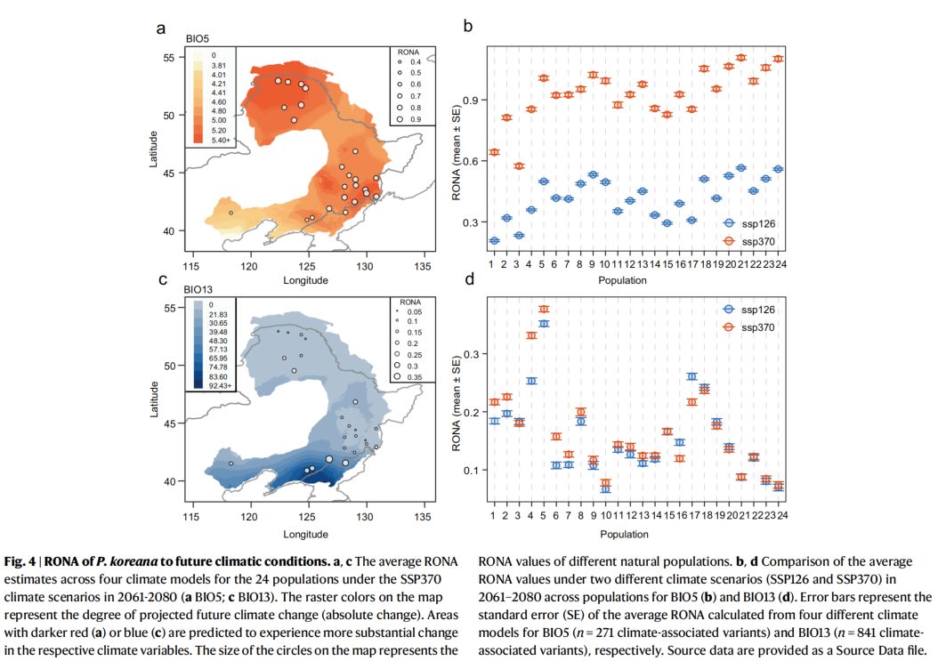 作者首先计算了不适应风险系数(risk of non-adaptedness; RONA),该方法基于等位基因频率与当代气候变量建立线性关系后,对适应未来气候条件所需的等位基因频率改变进行预测,基因组上做出的需要改变越大表明适应潜力越差。结果表明,尽管RONA的值在未来的四个气候模型中存在数值差异,但趋势高度相关。因此,作者采用不同模型的平均RONA值来比较其在种群间的差异。对于大多数环境变量,RONA随着气候变化的剧烈程度不断增加(Fig 4)。作者选择BIO5和BIO13这两个变量的预测作为代表性结果进行展示,发现位于环境变化更剧烈地区的种群有更大的RONA值(Fig 4a,c):北部和南部群体应对未来温度变化的潜力都比较差(Fig 4,b),而在面对降水时,在未来可能会经历强降雨或极端降水事件的南部群体有更高的RONA值(Fig 4c,d)。