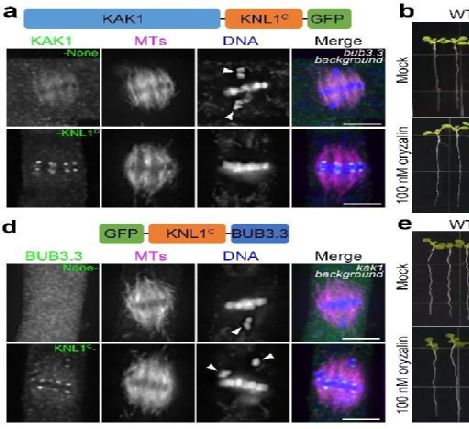 进一步研究发现,KAK1与BUB3.3之间存在相互依赖的关系,它们共同协作以确保动粒的定位。将KAK1人工锚定在动粒上可以恢复bub3.3突变体染色体整列缺陷的表型。反之将BUB3.3人工锚定到动粒上却不能恢复kak1突变体的表型。这表明BUB3.3作用于KAK1的上游,以影响KAK1在动粒上定位的方式参与染色体集会的调控。此外,点突变和截短实验分析发现KAK1的马达区域虽然对其执行功能是必需的,但并不影响其在动粒上的定位。