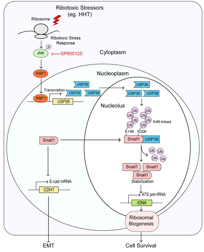 综上,该研究表明激活JNK-USP36-Snail1信号通路是实体肿瘤抵抗核糖体毒性应激的关键分子机制,联合HHT及JNK-USP36-Snail1通路抑制剂是一种潜在的实体肿瘤治疗新策略。